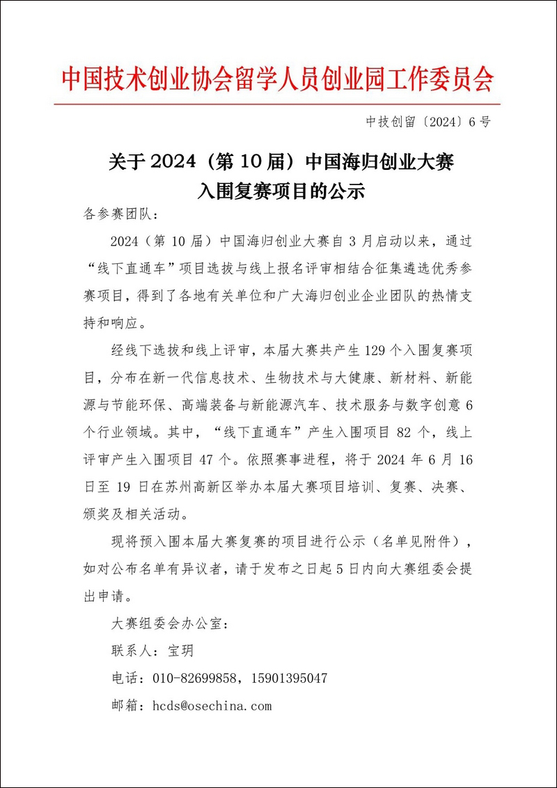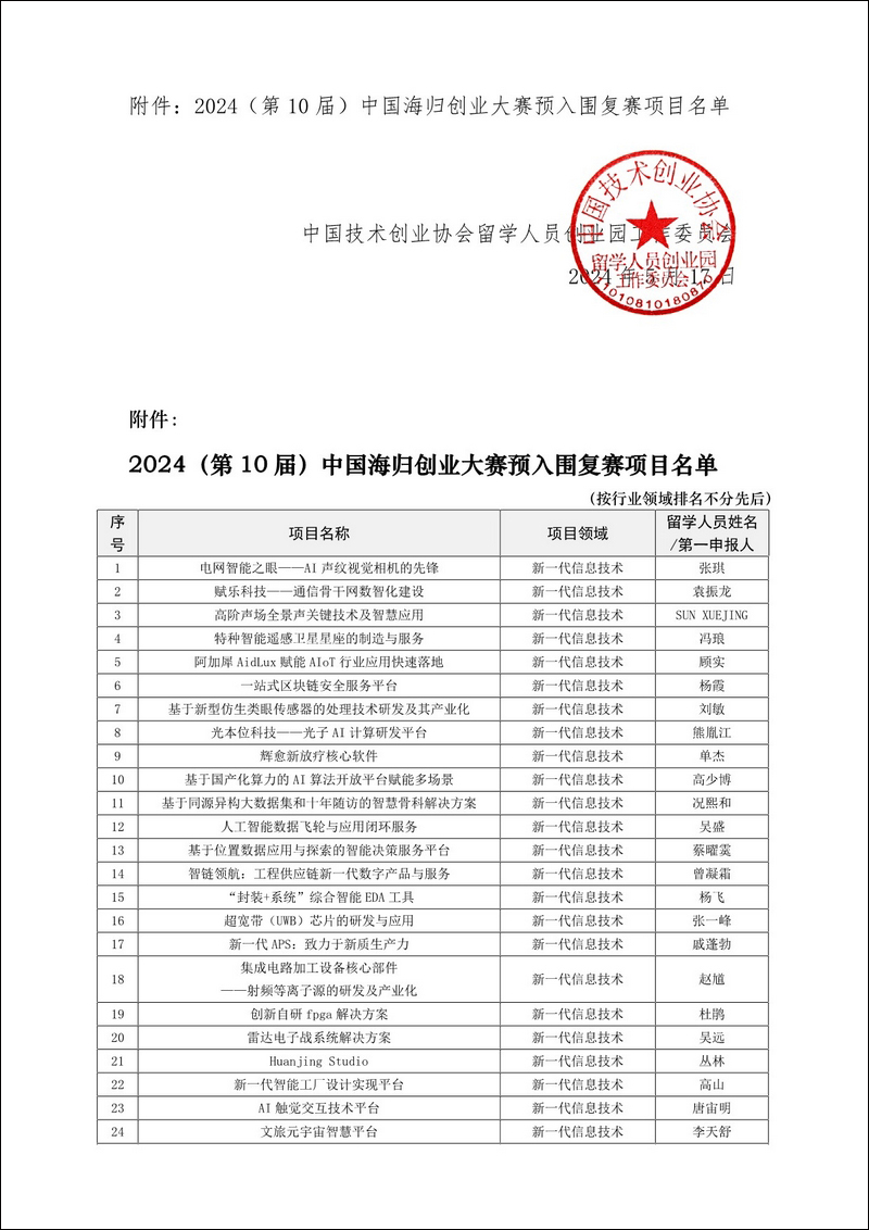 發(fā)文時間:2024-05-17 發(fā)文單位:中國技術(shù)創(chuàng)業(yè)協(xié)會留學(xué)人員創(chuàng)業(yè)園工作委員會 中技創(chuàng)留〔2024〕6號